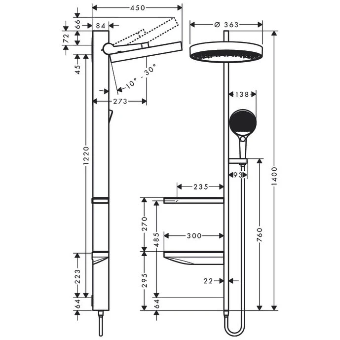 - stufenlos verstellbarer Neigungswinkel des Brausehalters