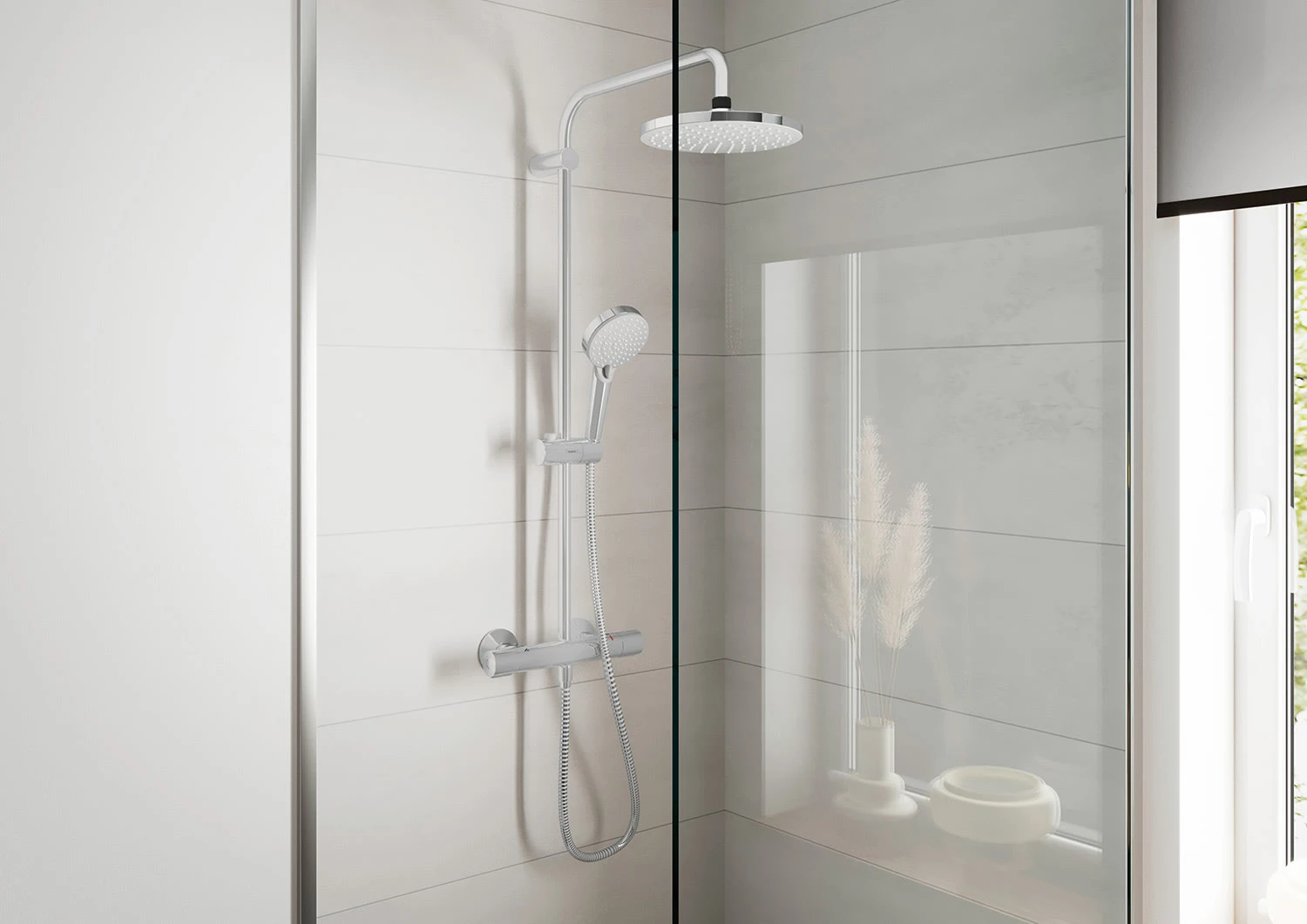 - bestehend aus: Kopfbrause, Handbrause, Brausethermostat, Brauseschlauch und Handbrausehalterung