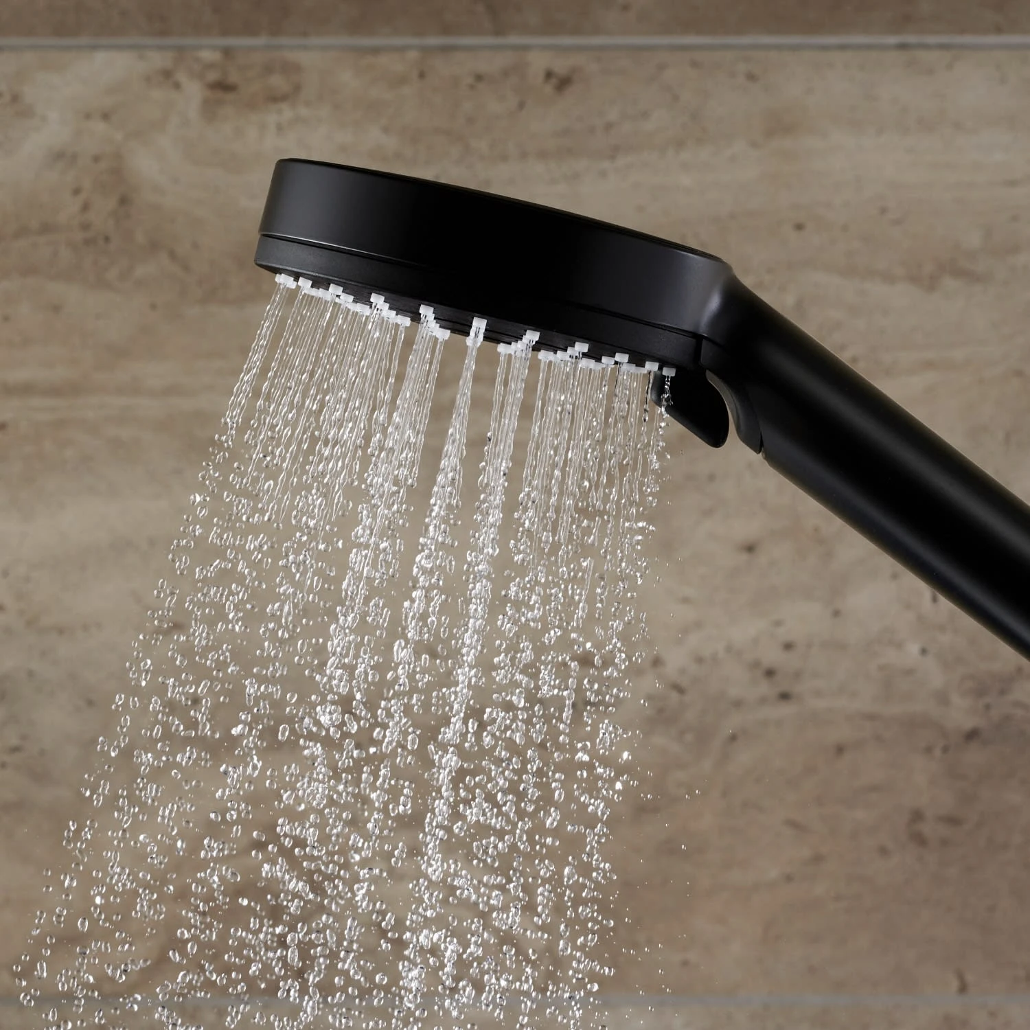 - schnelle Strahlumstellung: direkt am Duschkopf durch Drehen der Strahlscheibe